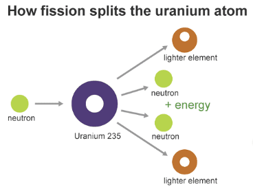 Nuclear energy is the energy in the nucleus of an atom—it is the energy that holds neutrons and protons. Nuclear energy can be used to produce electricity. This energy can be obtained in two ways: nuclear fusion and nuclear fission. In nuclear fusion, energy is released when atoms are combined (or fused together) to form a larger atom. Nuclear fission is when atoms are split apart, releasing energy. [1]